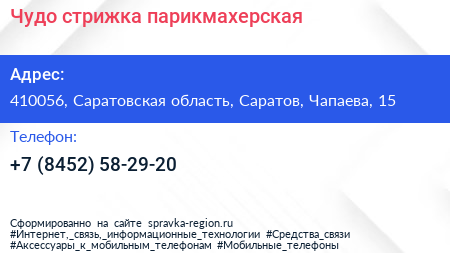 Чудо стрижка, парикмахерская по адресу 410056, Саратовская область, Саратов, Чапаева, 15 в дальнейшем Организация, размещена в следующих категориях: