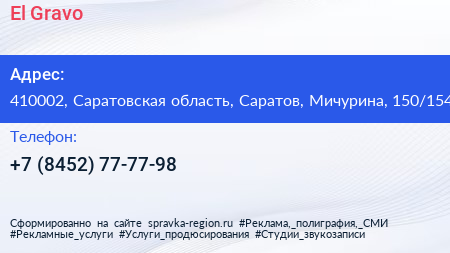 El Gravo по адресу 410002, Саратовская область, Саратов, Мичурина, 150/154 в дальнейшем Организация, размещена в следующих категориях: