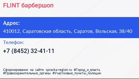 FLINT, барбершоп по адресу 410012, Саратовская область, Саратов, Вольская, 38/40 в дальнейшем Организация, размещена в следующих категориях: