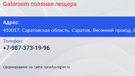 Galoroom, соляная пещера по адресу 410017, Саратовская область, Саратов, Весенний проезд, 8 в дальнейшем Организация, размещена в следующих категориях: