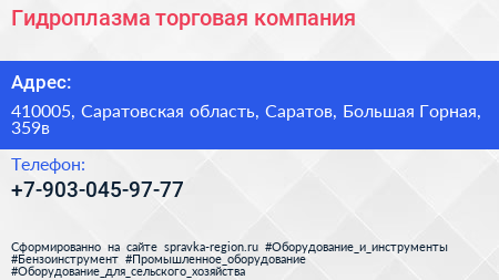 Гидроплазма, торговая компания по адресу 410005, Саратовская область, Саратов, Большая Горная, 359в в дальнейшем Организация, размещена в следующих категориях: