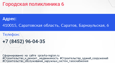 Городская поликлиника №6 по адресу 410015, Саратовская область, Саратов, Барнаульская, 6 в дальнейшем Организация, размещена в следующих категориях: