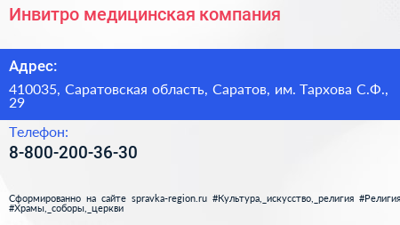 Инвитро, медицинская компания по адресу 410035, Саратовская область, Саратов, им. Тархова С.Ф., 29 в дальнейшем Организация, размещена в следующих категориях:
