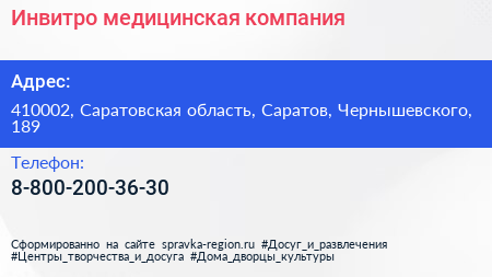Инвитро, медицинская компания по адресу 410002, Саратовская область, Саратов, Чернышевского, 189 в дальнейшем Организация, размещена в следующих категориях: