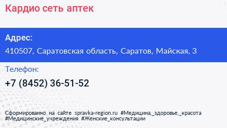 Кардио, сеть аптек по адресу 410507, Саратовская область, Саратов, Майская, 3 в дальнейшем Организация, размещена в следующих категориях: