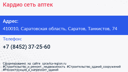 Кардио, сеть аптек по адресу 410010, Саратовская область, Саратов, Танкистов, 74 в дальнейшем Организация, размещена в следующих категориях: