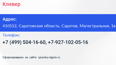 Клевер по адресу 410512, Саратовская область, Саратов, Магистральная, 1в в дальнейшем Организация, размещена в следующих категориях: