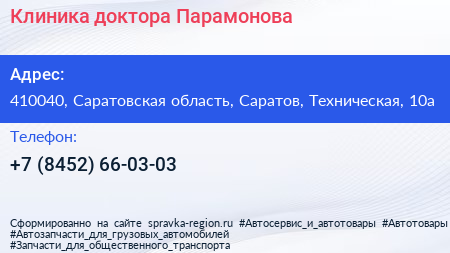 Клиника доктора Парамонова по адресу 410040, Саратовская область, Саратов, Техническая, 10а в дальнейшем Организация, размещена в следующих категориях:
