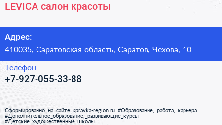 LEVICA, салон красоты по адресу 410035, Саратовская область, Саратов, Чехова, 10 в дальнейшем Организация, размещена в следующих категориях: