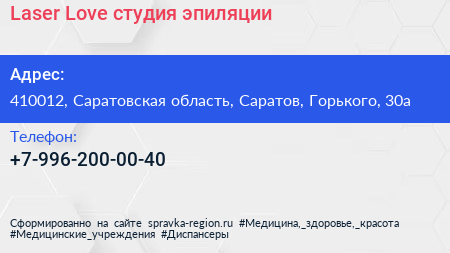 Laser Love, студия эпиляции по адресу 410012, Саратовская область, Саратов, Горького, 30а в дальнейшем Организация, размещена в следующих категориях: