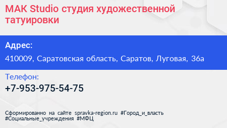 МАК Studio, студия художественной татуировки по адресу 410009, Саратовская область, Саратов, Луговая, 36а в дальнейшем Организация, размещена в следующих категориях:
