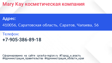 Mary Kay, косметическая компания по адресу 410056, Саратовская область, Саратов, Чапаева, 56 в дальнейшем Организация, размещена в следующих категориях: