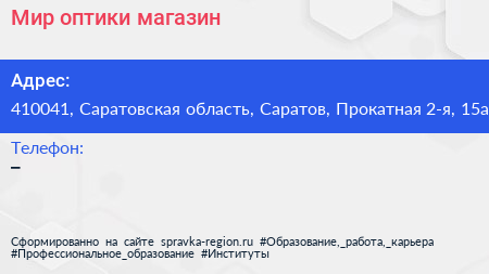 Мир оптики, магазин по адресу 410041, Саратовская область, Саратов, Прокатная 2-я, 15а в дальнейшем Организация, размещена в следующих категориях: