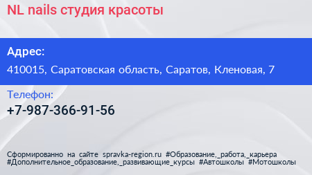 NL nails, студия красоты по адресу 410015, Саратовская область, Саратов, Кленовая, 7 в дальнейшем Организация, размещена в следующих категориях: