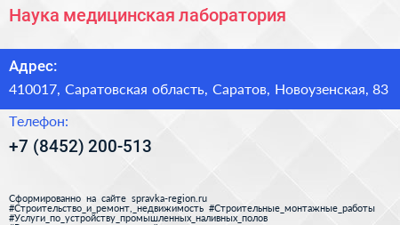 Наука, медицинская лаборатория по адресу 410017, Саратовская область, Саратов, Новоузенская, 83 в дальнейшем Организация, размещена в следующих категориях: