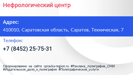 Нефрологический центр по адресу 410010, Саратовская область, Саратов, Техническая, 7 в дальнейшем Организация, размещена в следующих категориях: