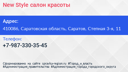 New Style, салон красоты по адресу 410086, Саратовская область, Саратов, Степная 3-я, 11 в дальнейшем Организация, размещена в следующих категориях: