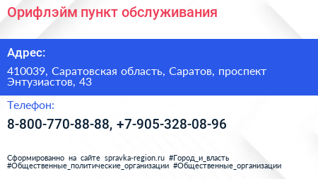Орифлэйм, пункт обслуживания по адресу 410039, Саратовская область, Саратов, проспект Энтузиастов, 43 в дальнейшем Организация, размещена в следующих категориях: