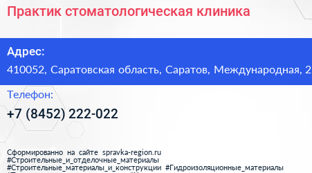 Практик, стоматологическая клиника по адресу 410052, Саратовская область, Саратов, Международная, 2 в дальнейшем Организация, размещена в следующих категориях: