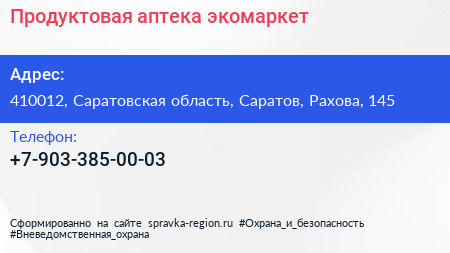 Продуктовая аптека, экомаркет по адресу 410012, Саратовская область, Саратов, Рахова, 145 в дальнейшем Организация, размещена в следующих категориях: