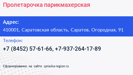 Пролетарочка, парикмахерская по адресу 410001, Саратовская область, Саратов, Огородная, 91 в дальнейшем Организация, размещена в следующих категориях: