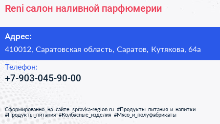Reni, салон наливной парфюмерии по адресу 410012, Саратовская область, Саратов, Кутякова, 64а в дальнейшем Организация, размещена в следующих категориях: