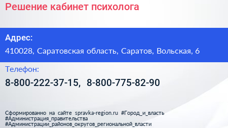 Решение, кабинет психолога по адресу 410028, Саратовская область, Саратов, Вольская, 6 в дальнейшем Организация, размещена в следующих категориях: