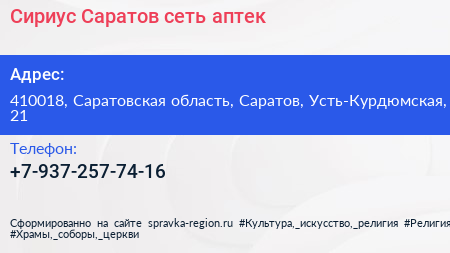 Сириус-Саратов, сеть аптек по адресу 410018, Саратовская область, Саратов, Усть-Курдюмская, 21 в дальнейшем Организация, размещена в следующих категориях: