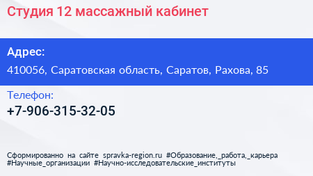 Студия 12, массажный кабинет по адресу 410056, Саратовская область, Саратов, Рахова, 85 в дальнейшем Организация, размещена в следующих категориях:
