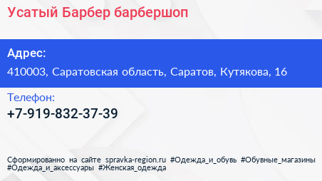 Усатый Барбер, барбершоп по адресу 410003, Саратовская область, Саратов, Кутякова, 16 в дальнейшем Организация, размещена в следующих категориях: