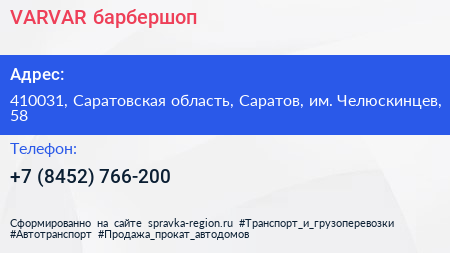 VARVAR, барбершоп по адресу 410031, Саратовская область, Саратов, им. Челюскинцев, 58 в дальнейшем Организация, размещена в следующих категориях: