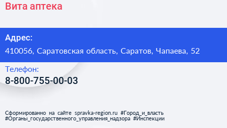 Вита, аптека по адресу 410056, Саратовская область, Саратов, Чапаева, 52 в дальнейшем Организация, размещена в следующих категориях: