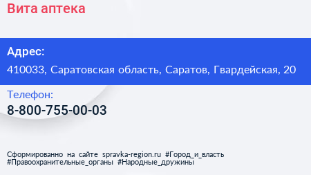 Вита, аптека по адресу 410033, Саратовская область, Саратов, Гвардейская, 20 в дальнейшем Организация, размещена в следующих категориях: