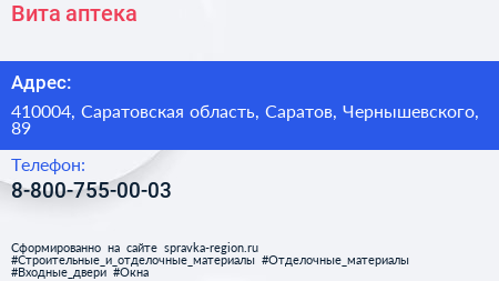 Вита, аптека по адресу 410004, Саратовская область, Саратов, Чернышевского, 89 в дальнейшем Организация, размещена в следующих категориях: