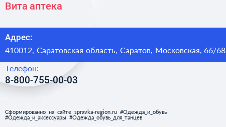 Вита, аптека по адресу 410012, Саратовская область, Саратов, Московская, 66/68 в дальнейшем Организация, размещена в следующих категориях: