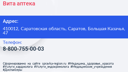 Вита, аптека по адресу 410012, Саратовская область, Саратов, Большая Казачья, 47 в дальнейшем Организация, размещена в следующих категориях: