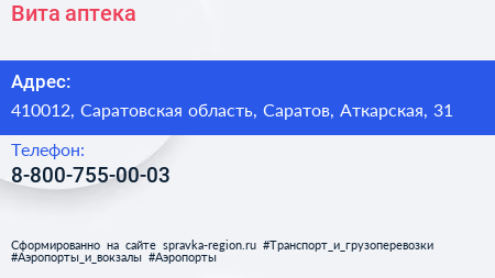 Вита, аптека по адресу 410012, Саратовская область, Саратов, Аткарская, 31 в дальнейшем Организация, размещена в следующих категориях: