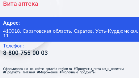 Вита, аптека по адресу 410018, Саратовская область, Саратов, Усть-Курдюмская, 11 в дальнейшем Организация, размещена в следующих категориях: