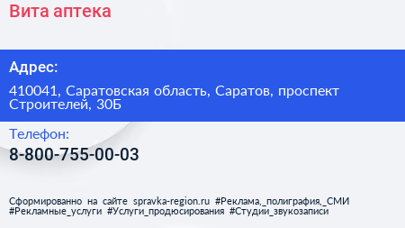 Вита, аптека по адресу 410041, Саратовская область, Саратов, проспект Строителей, 30Б в дальнейшем Организация, размещена в следующих категориях: