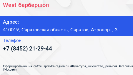 West, барбершоп по адресу 410019, Саратовская область, Саратов, Аэропорт, 3 в дальнейшем Организация, размещена в следующих категориях:
