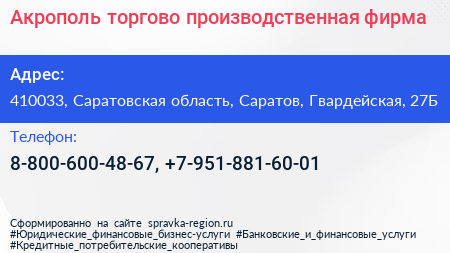 Акрополь, торгово-производственная фирма по адресу 410033, Саратовская область, Саратов, Гвардейская, 27Б в дальнейшем Организация, размещена в следующих категориях: