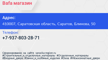 Bafa, магазин по адресу 410007, Саратовская область, Саратов, Блинова, 50 в дальнейшем Организация, размещена в следующих категориях: