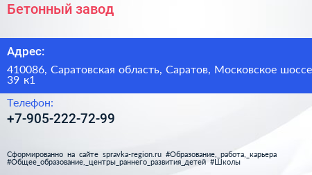 Бетонный завод по адресу 410086, Саратовская область, Саратов, Московское шоссе, 39 к1 в дальнейшем Организация, размещена в следующих категориях: