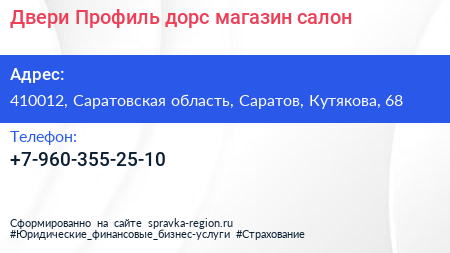 Двери Профиль дорс, магазин-салон по адресу 410012, Саратовская область, Саратов, Кутякова, 68 в дальнейшем Организация, размещена в следующих категориях: