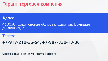 Гарант, торговая компания по адресу 410050, Саратовская область, Саратов, Большая Долинная, 6 в дальнейшем Организация, размещена в следующих категориях: