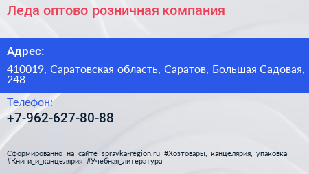 Леда, оптово-розничная компания по адресу 410019, Саратовская область, Саратов, Большая Садовая, 248 в дальнейшем Организация, размещена в следующих категориях: