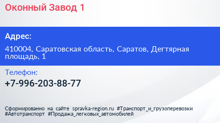 Оконный Завод №1 по адресу 410004, Саратовская область, Саратов, Дегтярная площадь, 1 в дальнейшем Организация, размещена в следующих категориях: