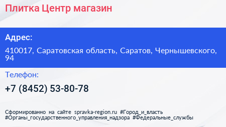 Плитка Центр, магазин по адресу 410017, Саратовская область, Саратов, Чернышевского, 94 в дальнейшем Организация, размещена в следующих категориях: