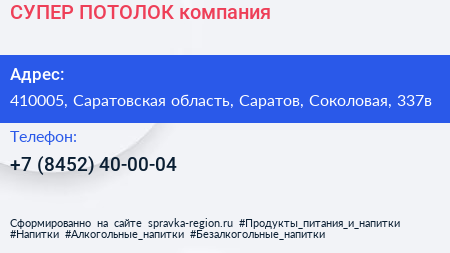 СУПЕР-ПОТОЛОК, компания по адресу 410005, Саратовская область, Саратов, Соколовая, 337в в дальнейшем Организация, размещена в следующих категориях: