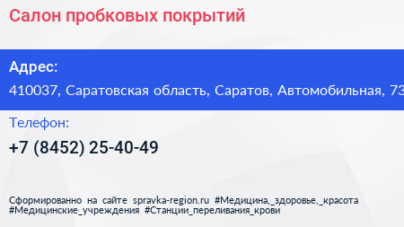 Салон пробковых покрытий по адресу 410037, Саратовская область, Саратов, Автомобильная, 73 в дальнейшем Организация, размещена в следующих категориях: